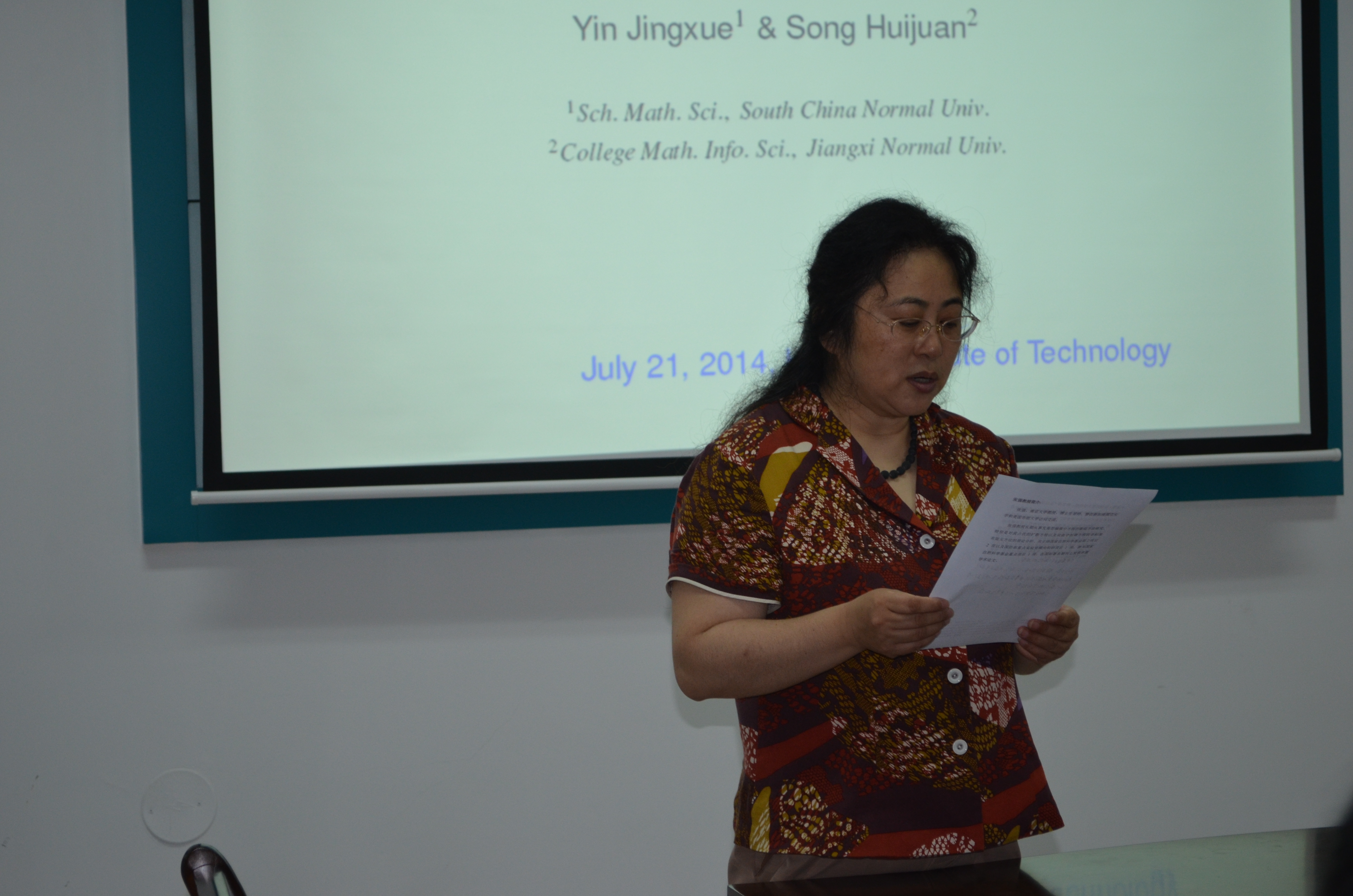 2014年7月21日上午10:30,华南师范大学尹景学教授在数学系会议室(格物楼503)做了题为《Classfications of Singularities of Solutions to the Weighted p-Laplacian with Orientated Convection》的学术报告,报告由吴勃英教授主持,数学系二十余位师生听取了学术报告并进行了热烈的讨论。