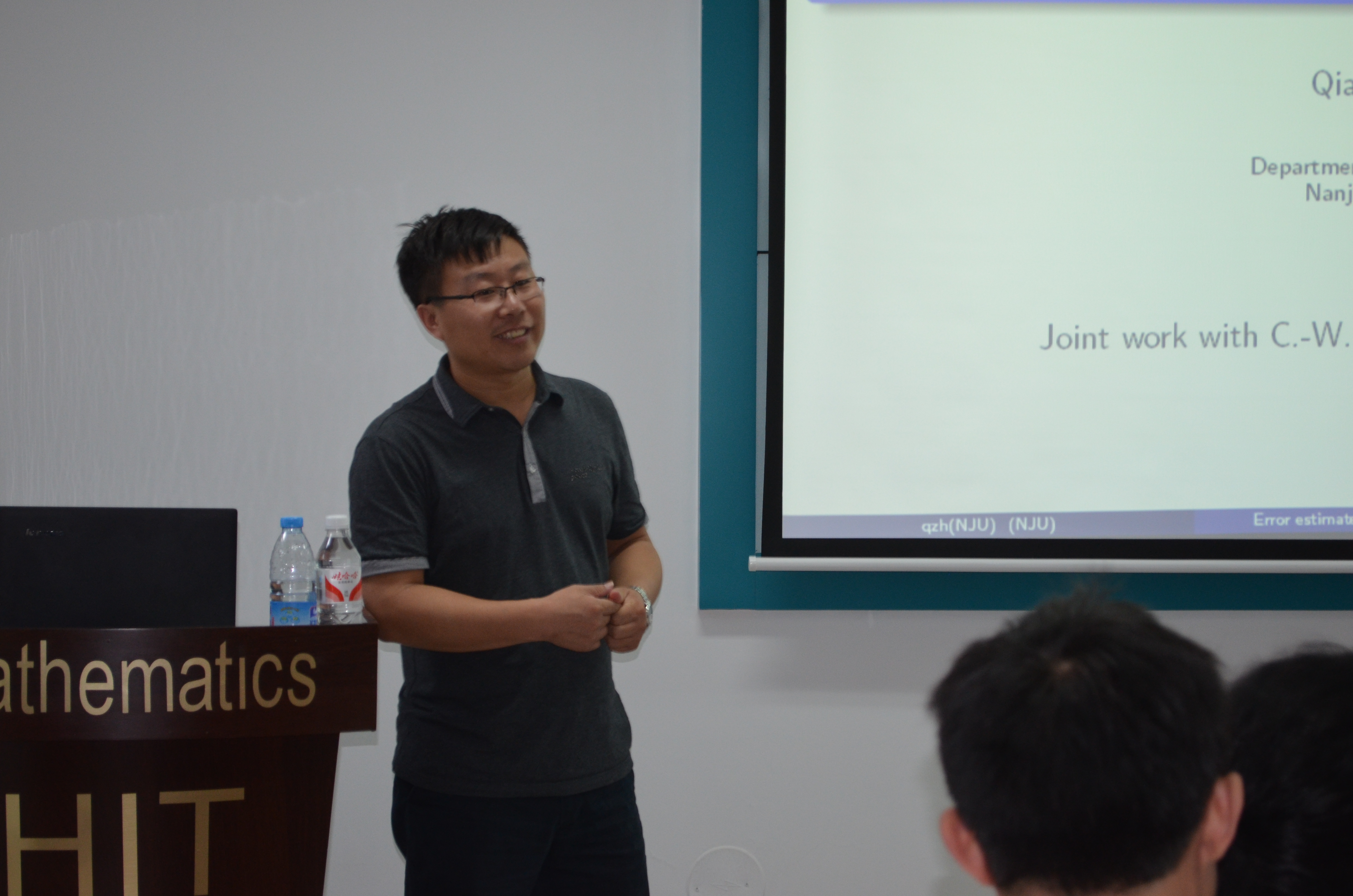 2014年7月21日下午2:00,南京大学张强教授在数学系会议室(格物楼503)做了题为《A priori error estimates on the fully-discrete discontinuous Galerkin method》的学术报告,报告由吴勃英教授主持,数学系二十余位师生听取了学术报告并进行了热烈的讨论。