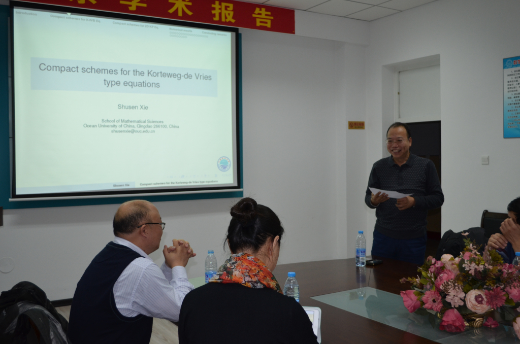 2014年11月15日 下午15:40-16:40,中国海洋大学数学科学学院信息与科学计算系主任谢树森教授、博士生导师在格物楼503做了题为《High-Order compact schemes for the KdV type equations》的学术报告,报告由李龙锁教授主持,数学系四十余位师生听取了报告并进行了热烈的讨论。