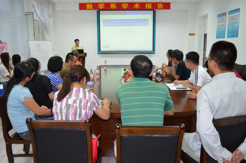 2015年7月3日下午3:30,美国爱荷华大学数学系教授韩渭敏老师在数学系会议室(格物楼503)做了题为《Hemivariational Inequalities: Modeling, Analysis and Numerical Solution》的学术报告,报告由韩波教授主持,数学系20余位师生听取了报告并进行了热烈的讨论。