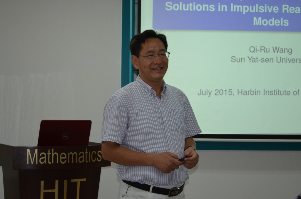 2015年7月24日上午8:30--9:30, 中山大学数学系王其如教授在数学系会议室(格物楼503)做了题为《一类带脉冲的反应扩散模型的渐近播速和行波解》的学术报告,报告由蒋卫华教授主持,数学系十余位师生听取了报告并进行了热烈的讨论。