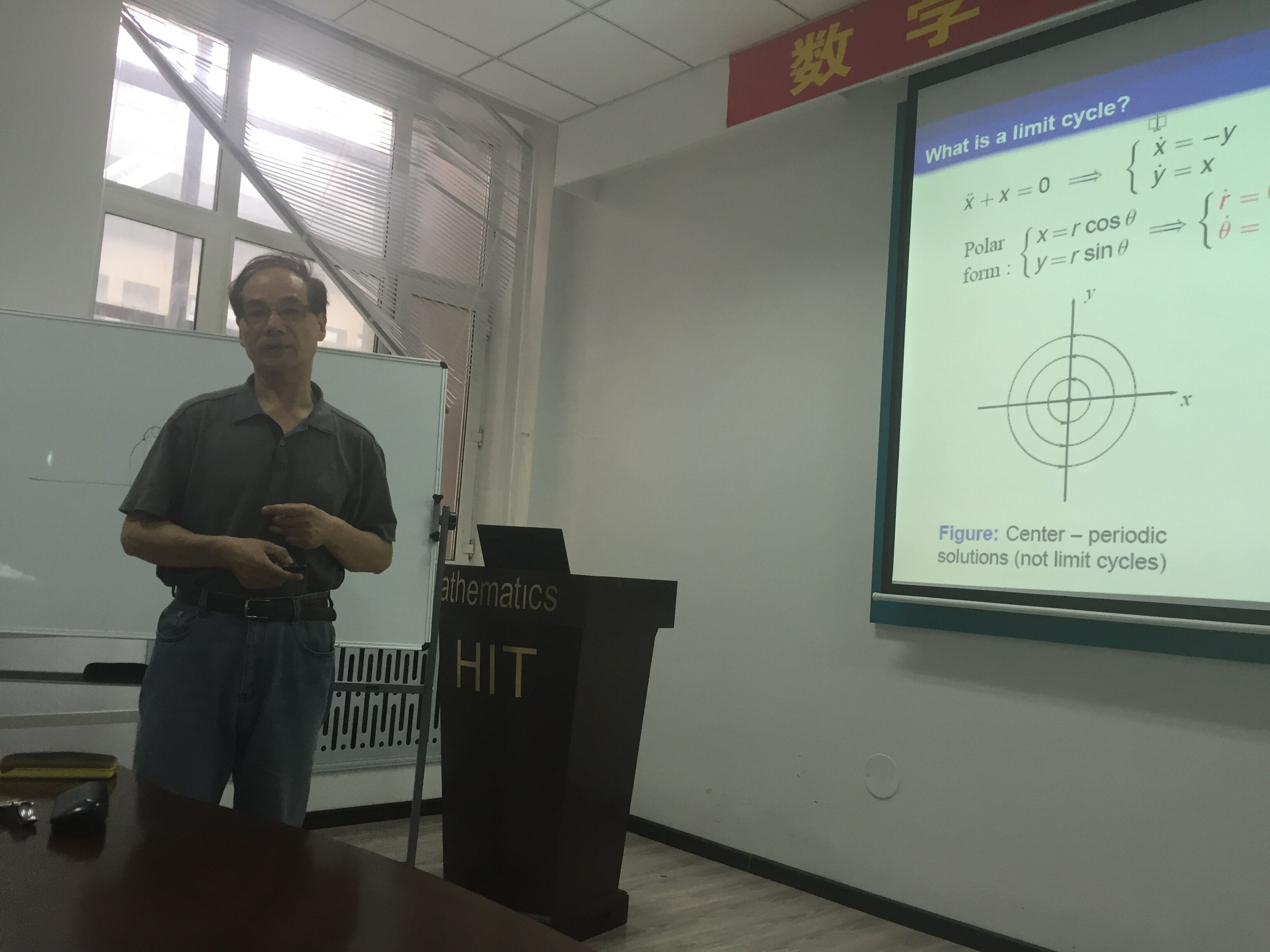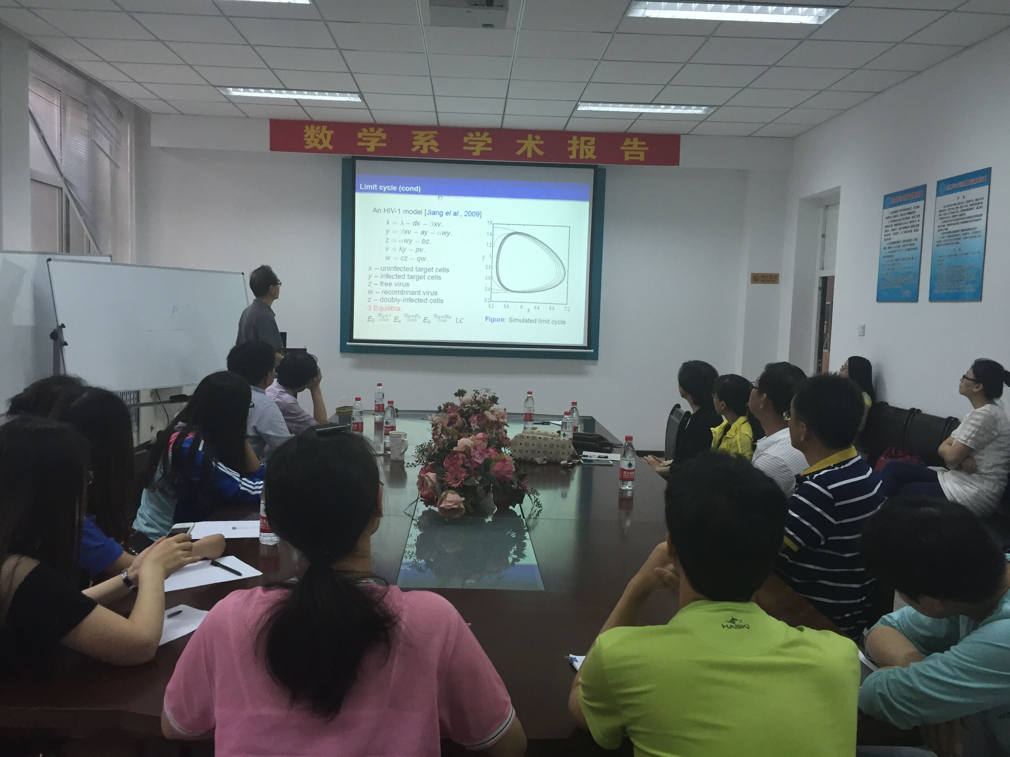 2016年6月25日上午9:00--10:00,加拿大西安大略大学郁培教授在数学系会议室(格物楼503)做了题为《Complex Dynamics in Biological Systems Arising from Multiple Limit Cycle Bifurcation》 学术报告,报告由蒋卫华老师主持,数学系20余位师生听取了报告,并进行了热烈的讨论。