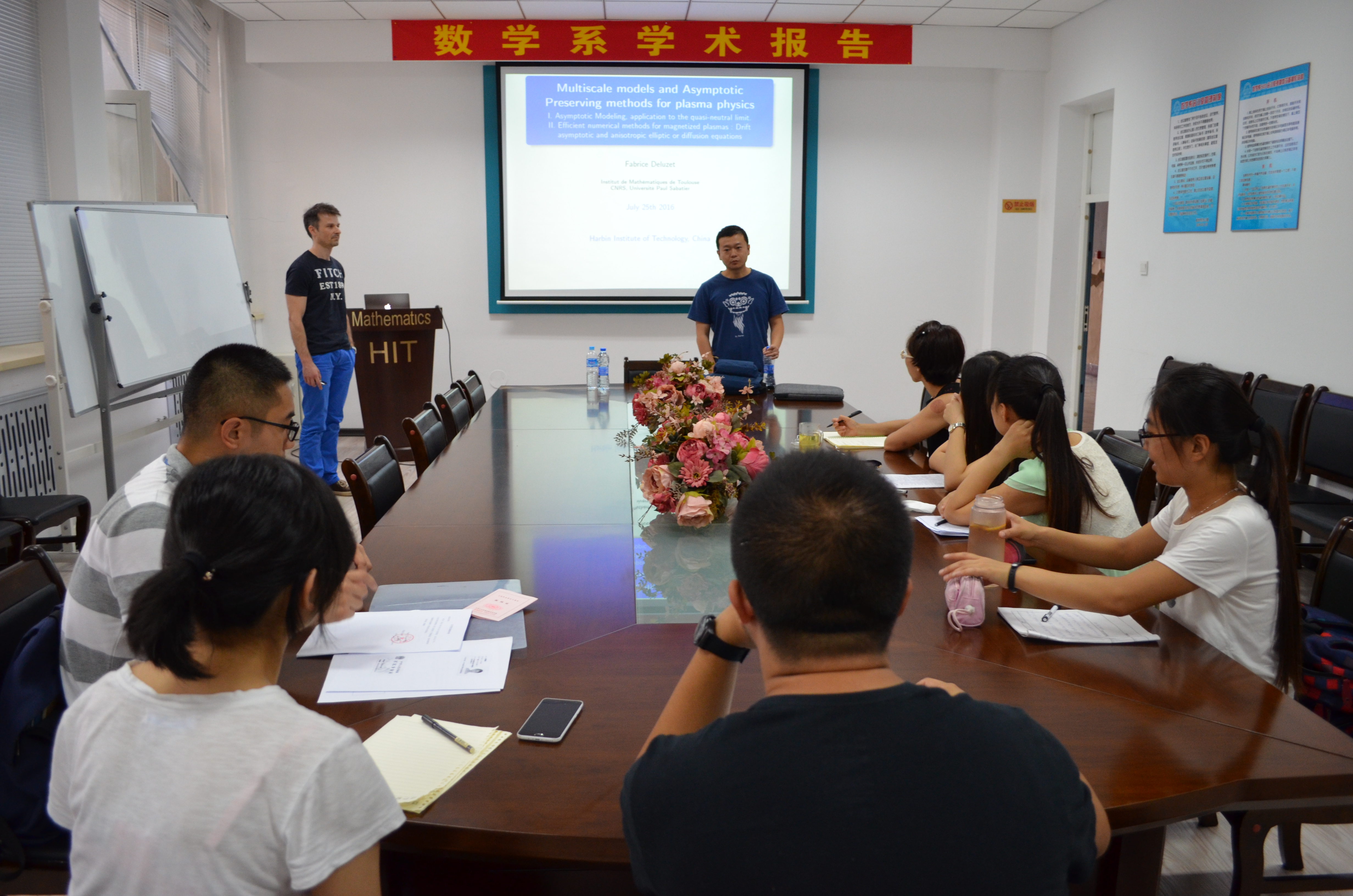 2016年7月25日上午,法国图卢兹第三大学Fabrice Deluzet高级研究工程师在数学系会议室(格物楼503)为我系师生带来了两场精彩的报告,题目分别为《Multiscale models and Asymptotic Preserving methods for plasma physics, Asymptotic Modeling and quasi-neutral limit》《Asymptotic modeling and efficient numerical method for magnetized plasmas : Drift asymptotic and anisotropic elliptic or diffusion equations》,报告由杨畅老师主持,数学系10余位师生听取了报告并进行了热烈的讨论。