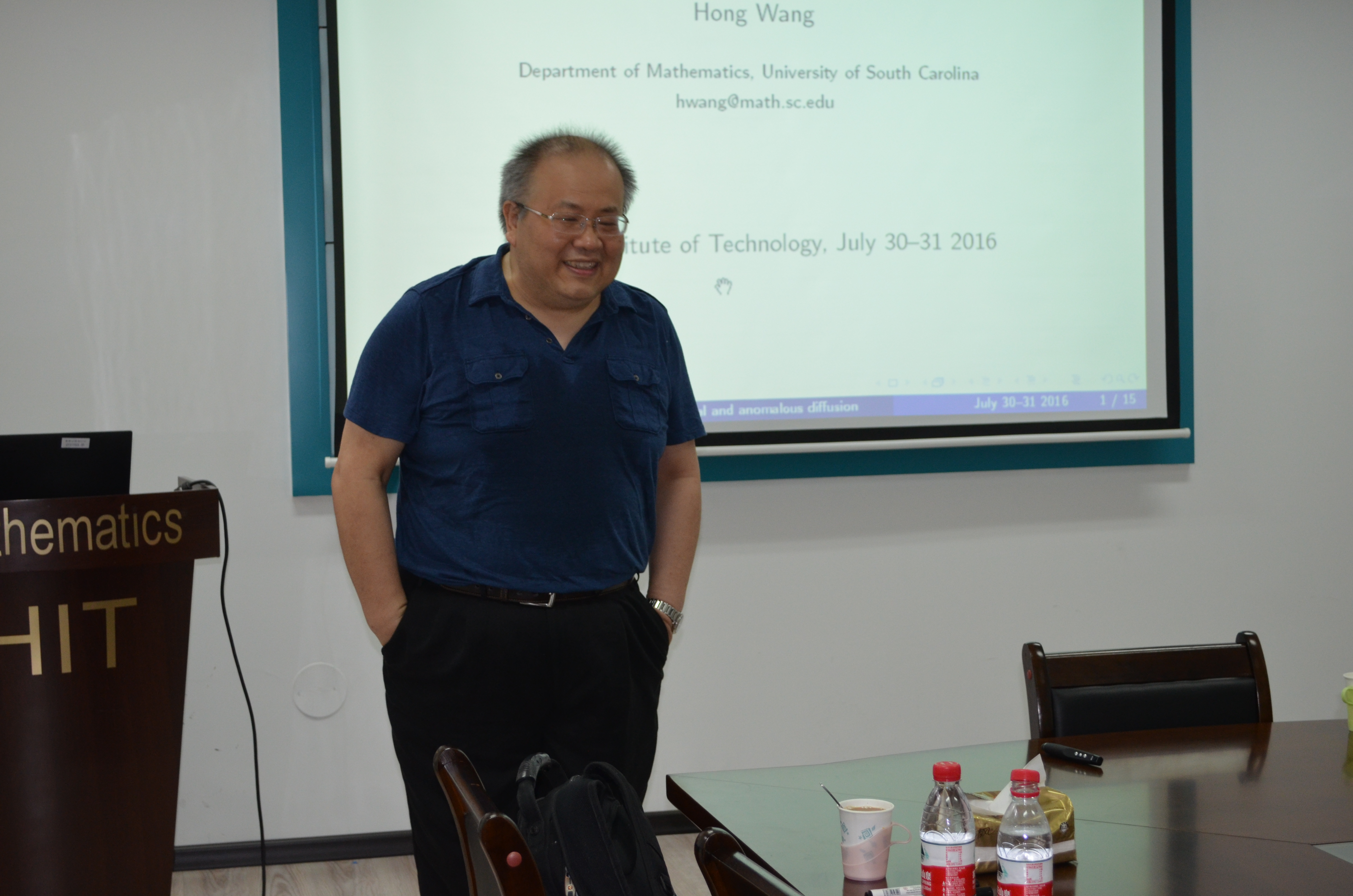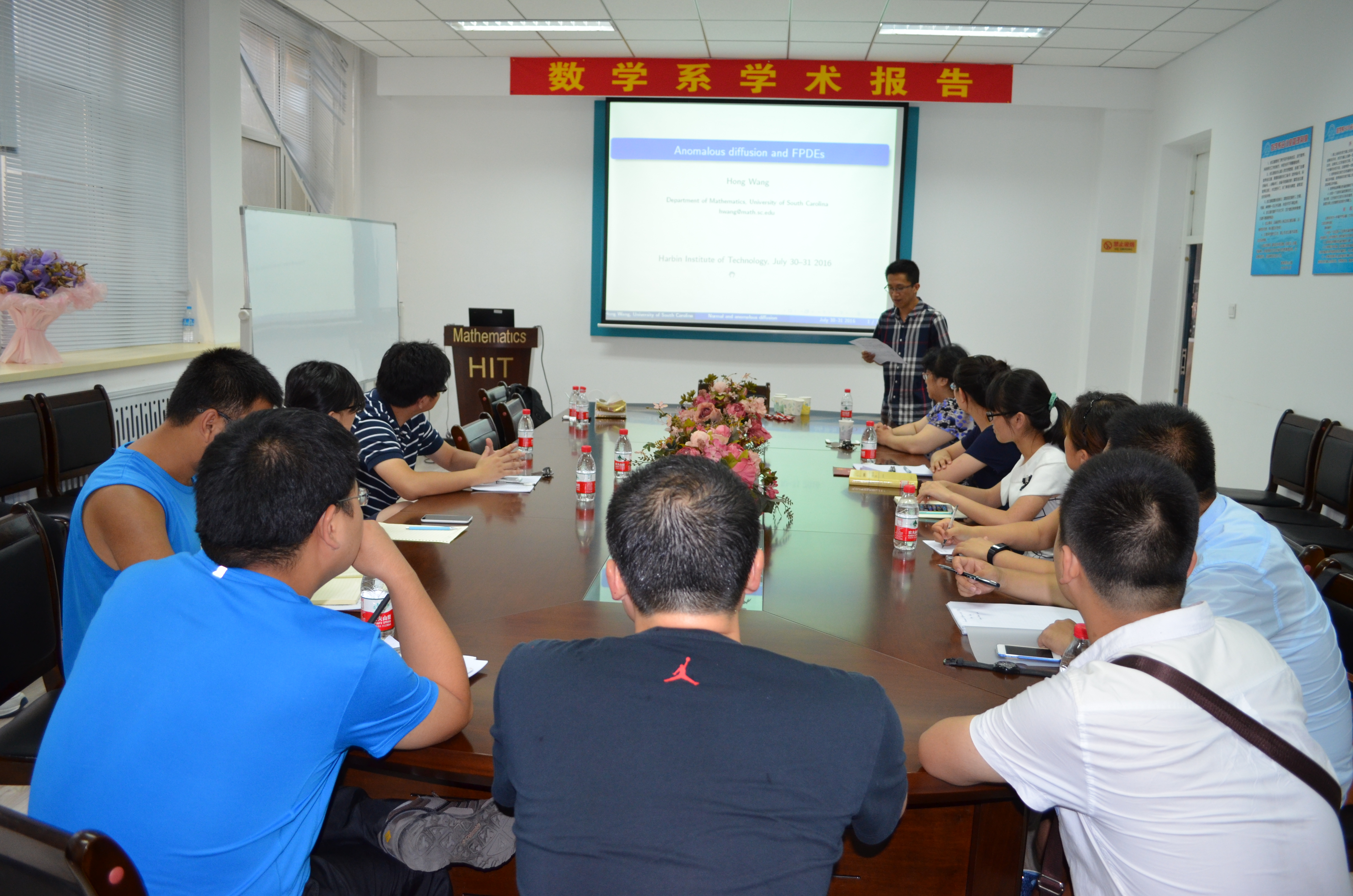 2016年7月30日下午和7月31日上午,南卡罗莱纳大学王宏教授在数学系会议室(格物楼503)做了4场精彩的报告,题目分别为:《Anomalous diffusion and fractional PDEs 》《Fast numerical methods for 》《Mathematical issues in the analysis of FPDEs》《An indirect method for FPDEs》,报告由孙杰宝老师主持,数学系20余位师生听取了报告并进行了热烈的讨论。