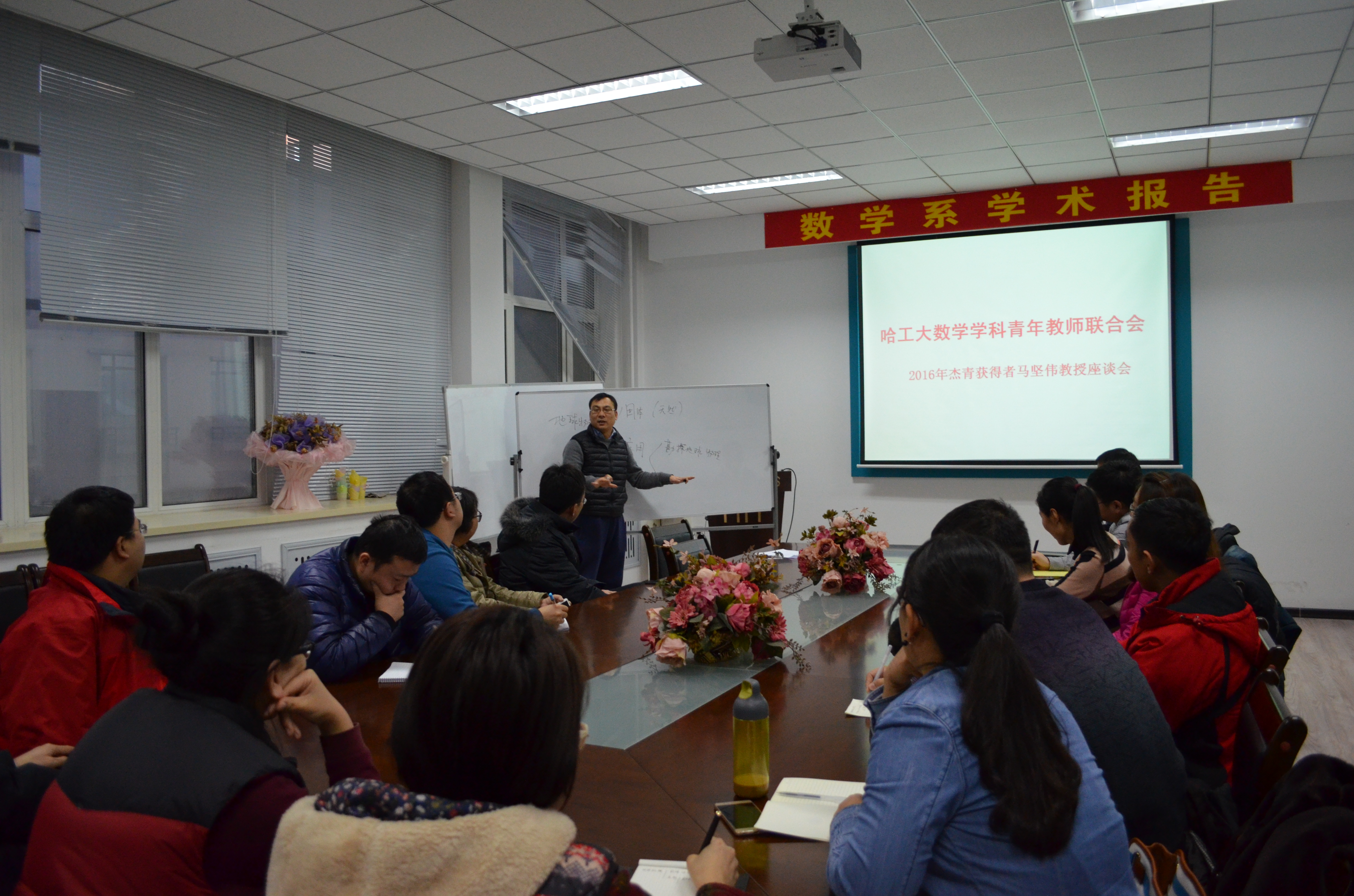 2016年12月16日下午3点,应哈工大数学学科青年教师联合会的邀请,数学系2016年国家杰出青年基金获得者马坚伟教授与青年教师在格物楼503,进行了一场旨在“如何在一个较长期的时间段里,深入做好科研工作”的座谈会,会议由联合会会长方健教授主持。与会的近20位青年教师各抒己见,会场讨论热烈。