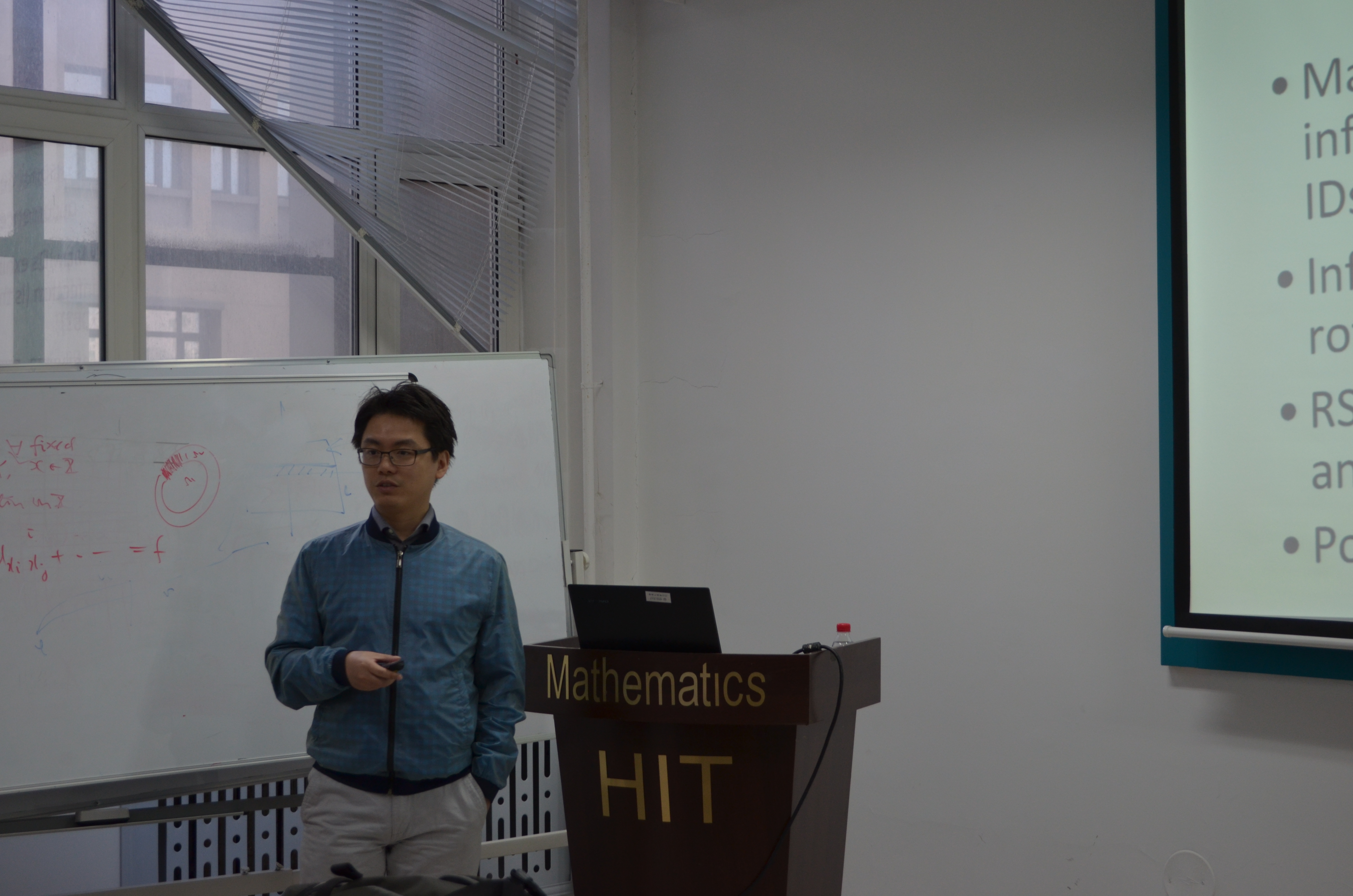 2017年5月15日 下午14:30,加拿大阿尔伯塔大学王皓教授在格物楼503会议室做了精彩的报告,题目为:A New Algorithm to Recover the Time Dependent Transmission Coefficient from Infection Data,报告由蒋卫华教授主持,数学系30余位师生听取了报告,并进行了热烈的讨论。
