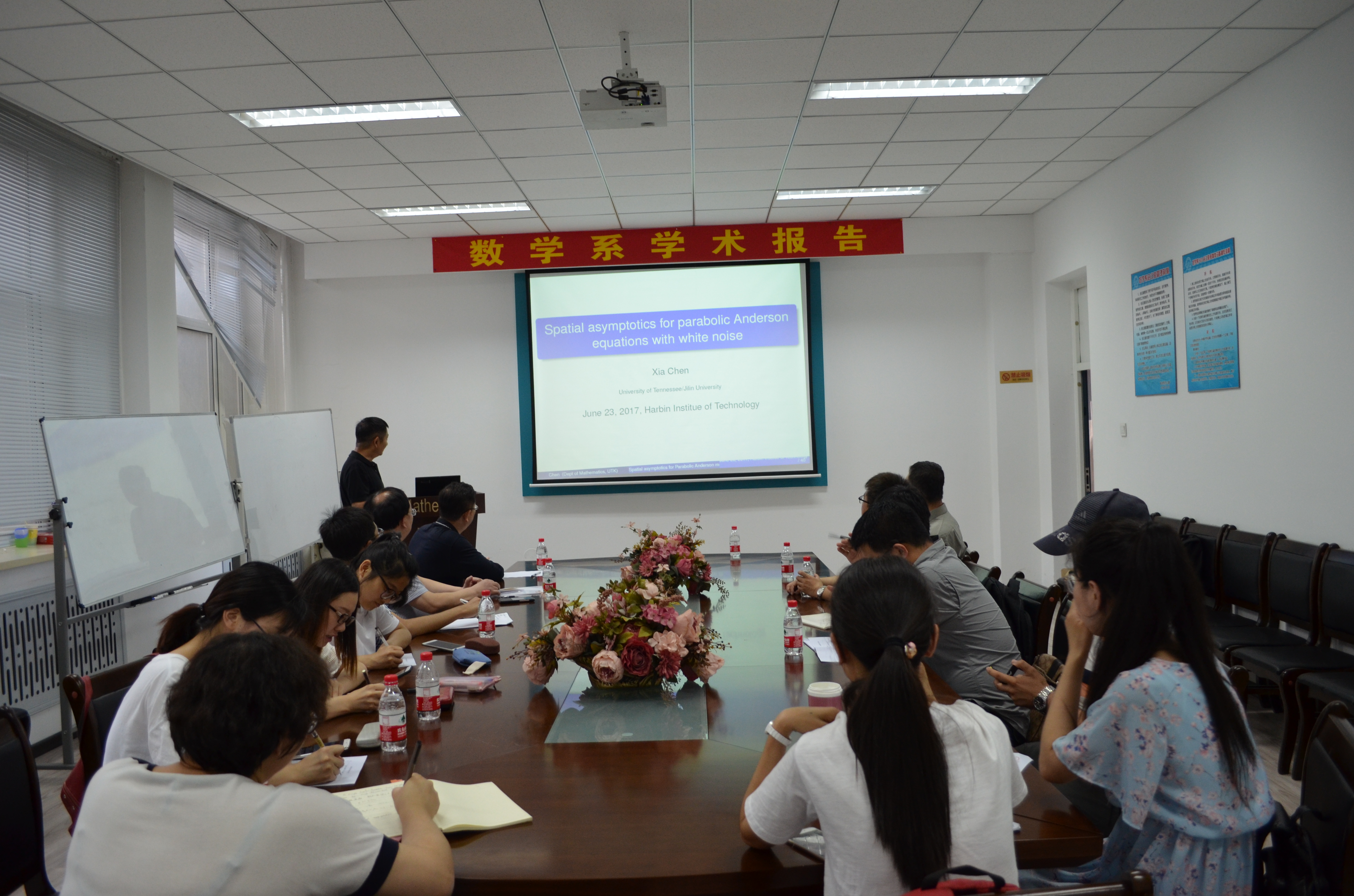 应suncitygroup太阳新城数学系田波平教授邀请,吉林大学特聘教授陈夏于2017年6月23日(周五)在suncitygroup太阳新城数学系进行学术访问,并于15:00-16:30在格物楼503会议室作学术报告,报告题目为:Spatial asymptotics for the parabolic Anderson models with generalized time-space Gaussian noise。报告由付永强教授主持,数学系20余位师生听取了报告,并进行了热烈的讨论。