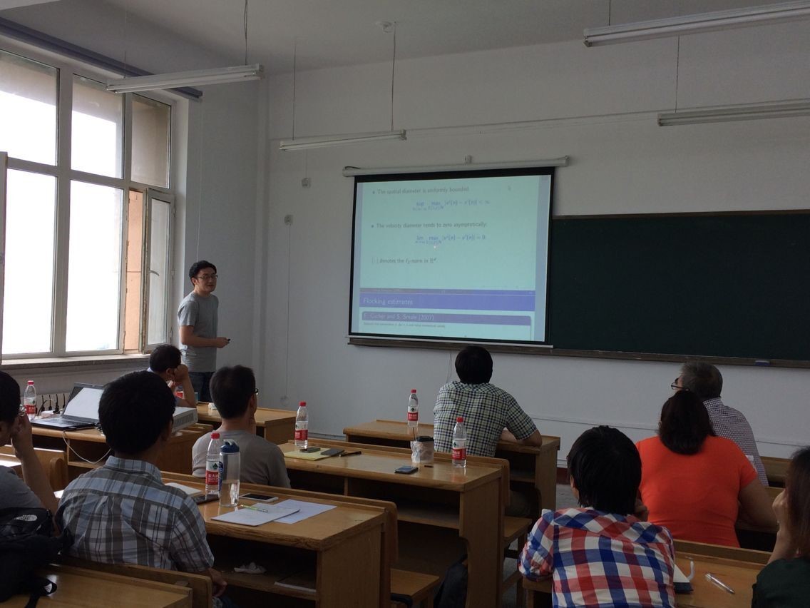 受suncitygroup太阳新城数学系和数学研究院的邀请,首尔国立大学数学科学系张雄韬博士于2017年6月21日在格物楼522报告厅做了题为“Uniform-in-time transition from discrete dynamics to continuous dynamics in the Cucker-Smale flocking”的学术报告,数学系相关专业的十余位师生参加学术报告并展开了讨论。