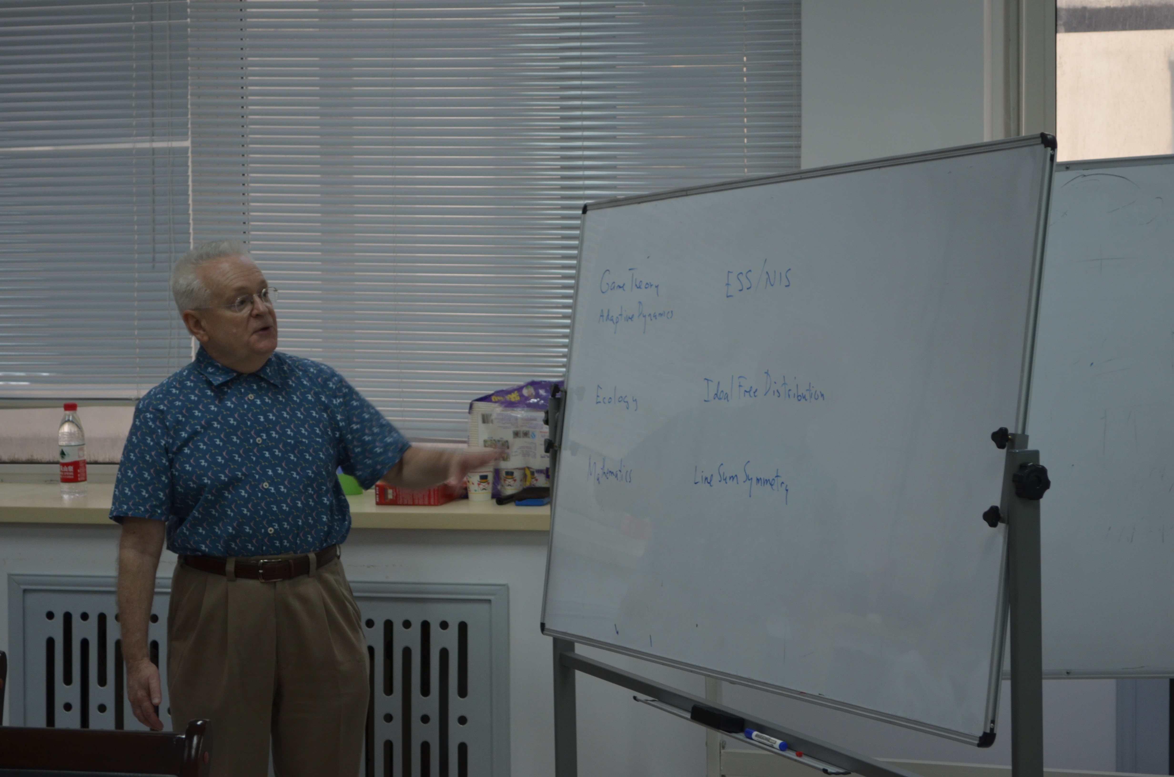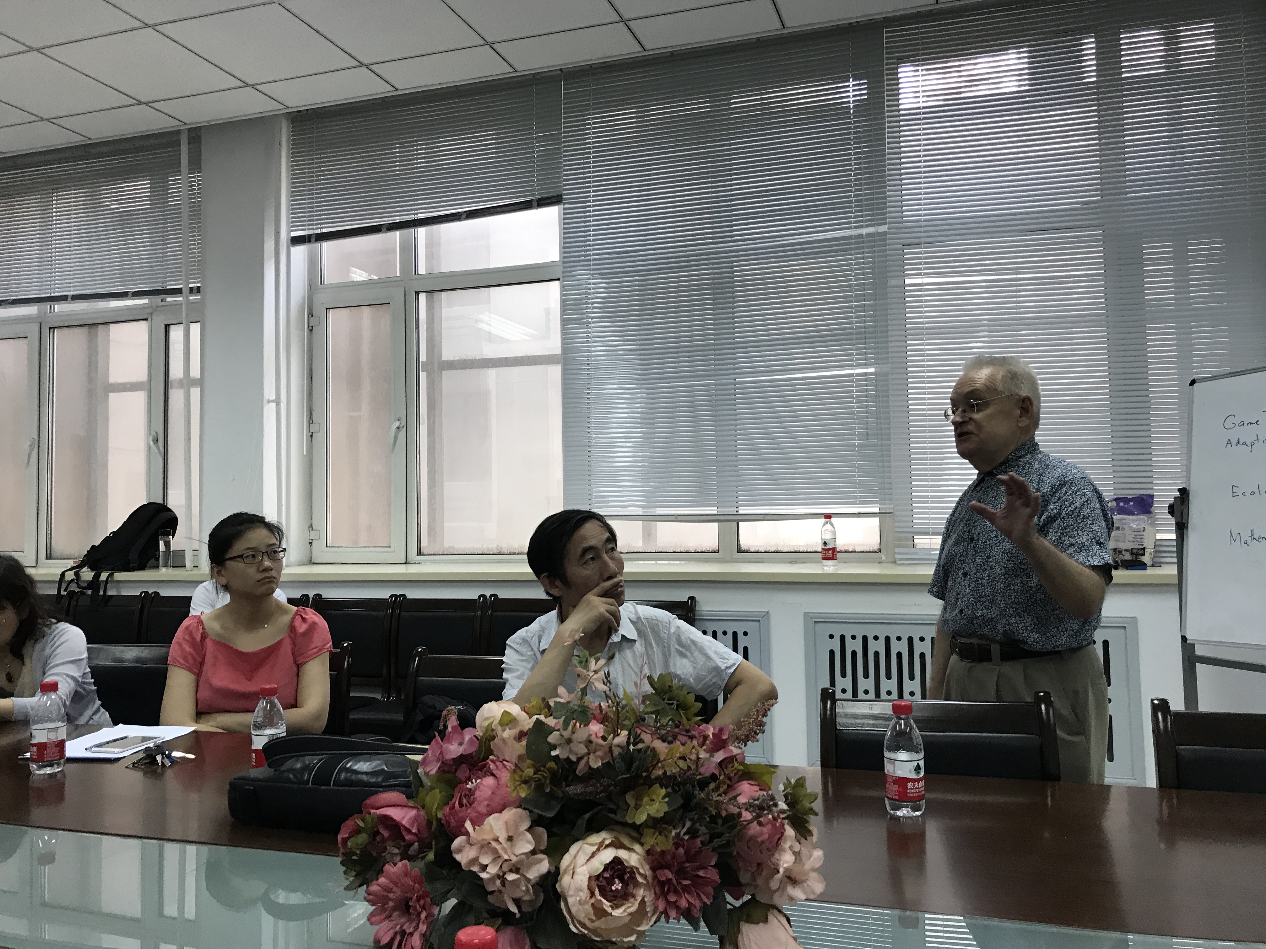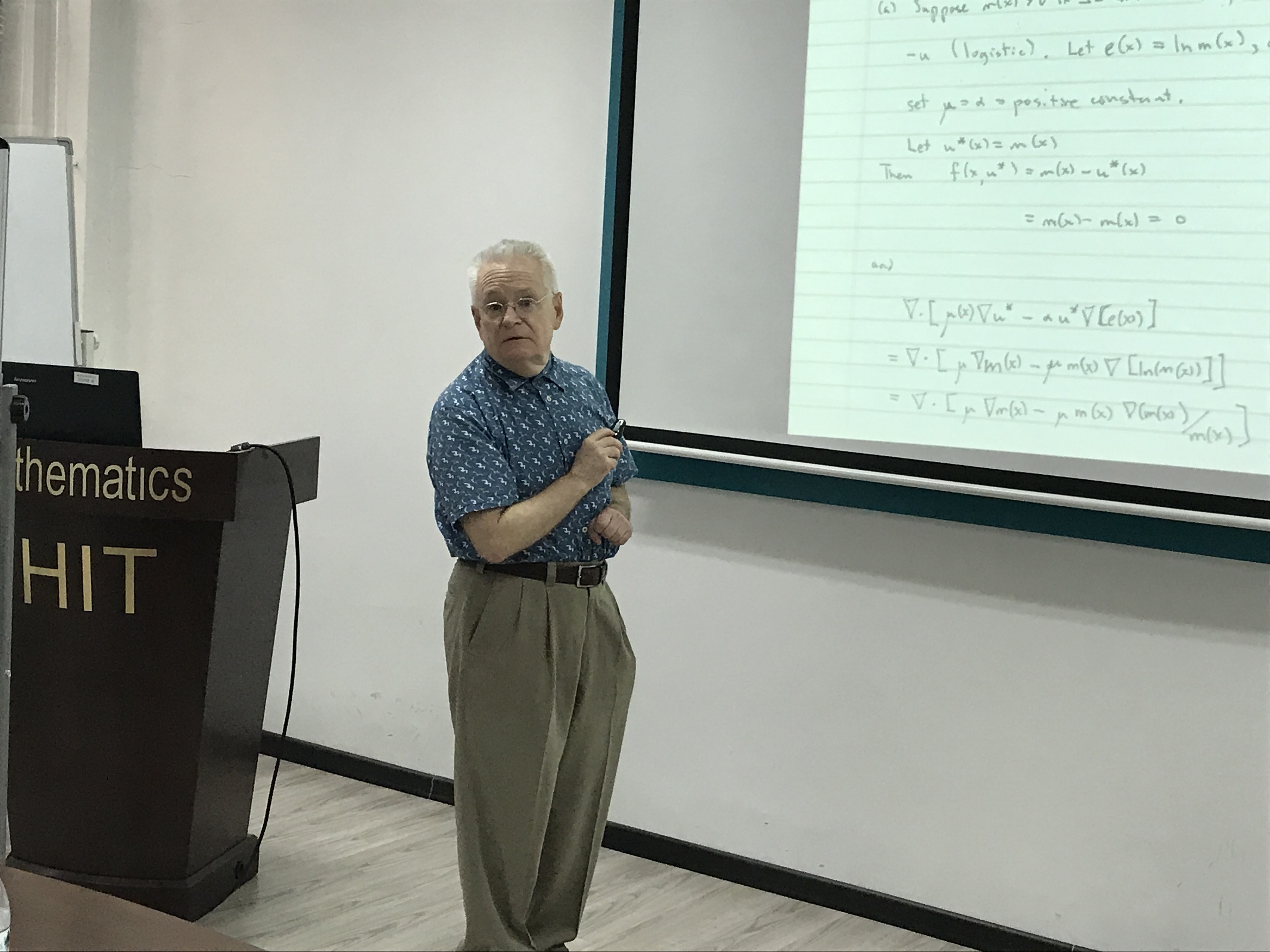 作为数学系SCI期刊编委校园行活动一部分,美国迈阿密大学数学系系主任、著名生物数学家Robert Stephen Cantrell 教授于2017年6月27-30日来哈访问交流,并做系列学术报告。从反应扩散方程的角度来探讨不均匀环境对种群动力学的影响,包括模型的建立和分析,介绍了关于Lotka-Volterra竞争系统的一些最新研究进展,并提出一些有趣的具有挑战性的问题。参加学术报告的师生来自哈尔滨地区的几个学校,包括哈工大、哈工程、哈理工和黑龙江大学,期间开展了激烈的互动和讨论。此次活动受国际合作处资助,由数学青年教师联合会承办。