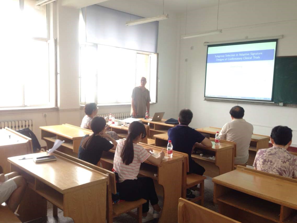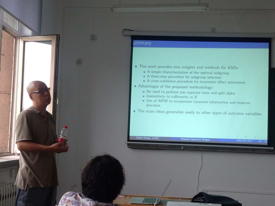 应数学系刘伟副教授邀请,美国加州大学河滨分校张志伟副教授于7月18日访问suncitygroup太阳新城数学系,并作题目为《Subgroup Selection in Adaptive Signature Designs of Confirmatory Clinical Trials》的报告。 张教授以精准医疗中有效治疗组的筛选为主题,于2017年7月18日上午10:00--11:30在格物楼522 进行了精彩的学术报告。该报告由刘伟副教授主持,相关专业的多位师生参与了讲座,并对讲座内容展开了热烈的讨论。张教授的报告理论与实践并重,语言深入浅出,得到了大家的一致好评。