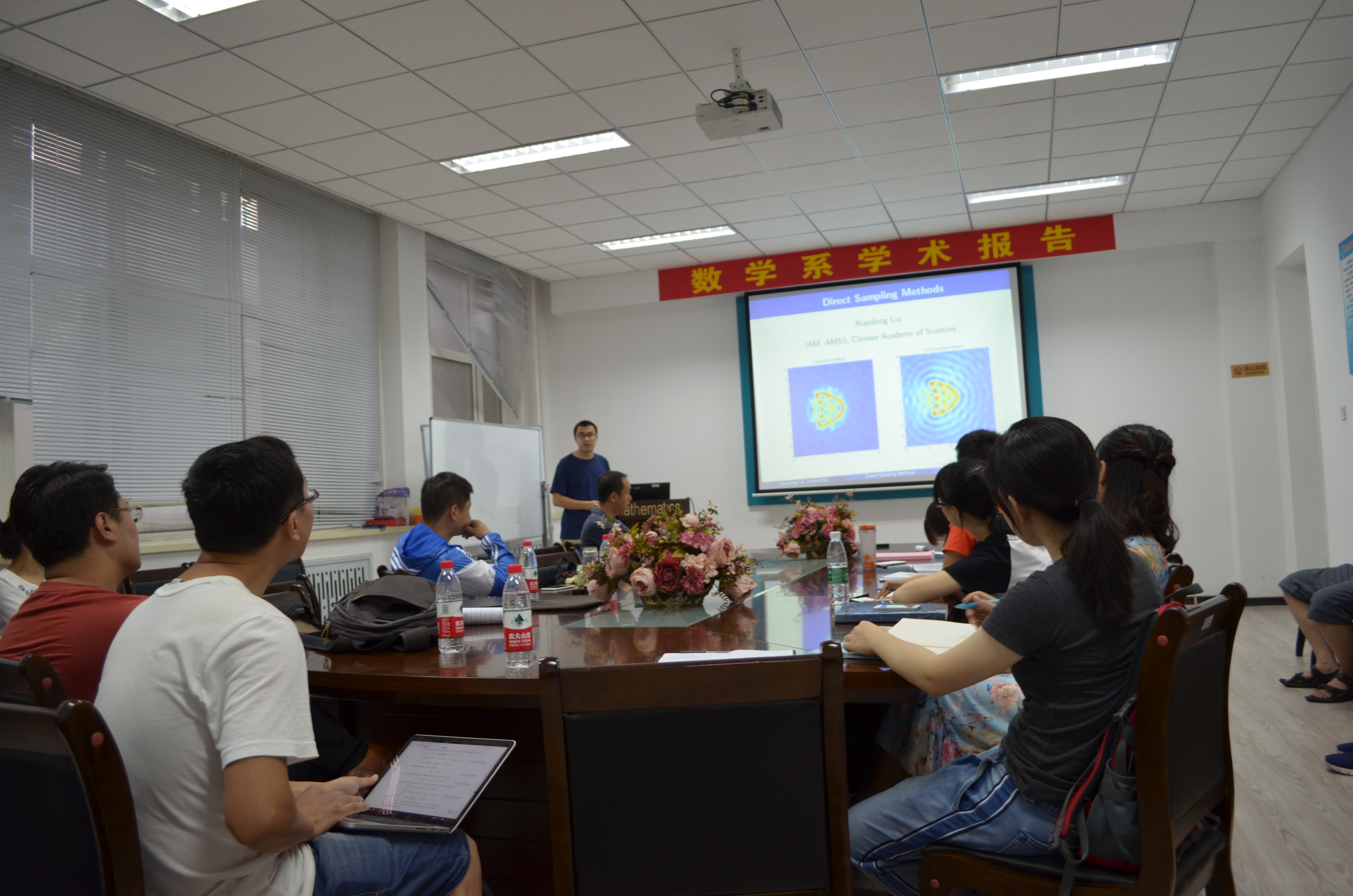 应数学系郭玉坤副教授的邀请,2017年7月10日至7月19日期间,中国科学院数学与系统科学研究院应用数学所刘晓东副研究员来公司访问,与数学系部分师生就反问题数值计算等问题进行了交流。7月17日上午8:30至9:15,刘晓东老师在格物楼503数学系报告厅做了一场《关于反问题计算中的直接采样算法》的学术报告。刘老师的报告系统深入地介绍了反散射理论的若干前沿热点问题及各种采样算法的基本思想。报告由郭玉坤副教授主持,相关专业的二十余位师生参加了讲座并进行了热烈讨论。