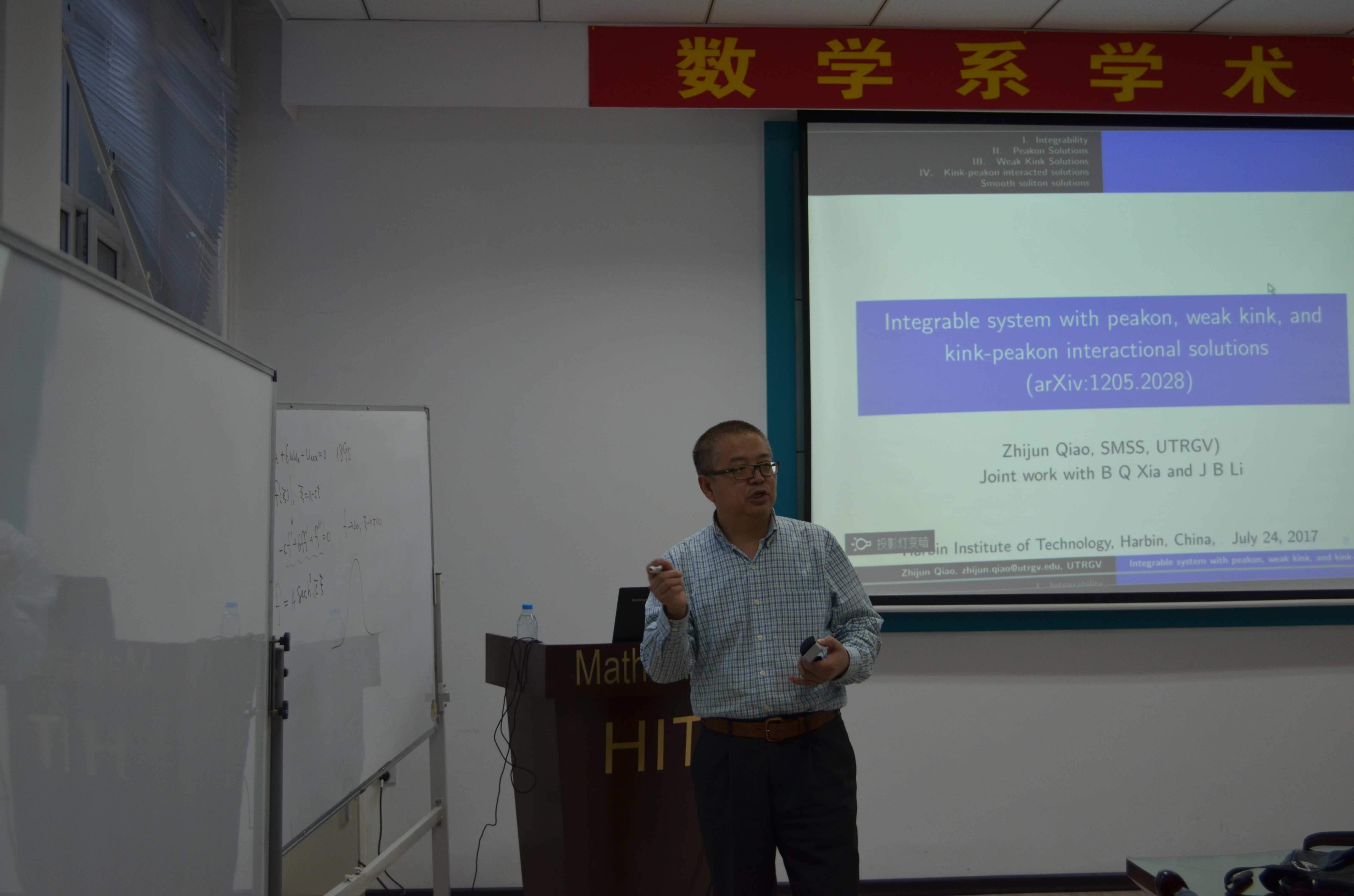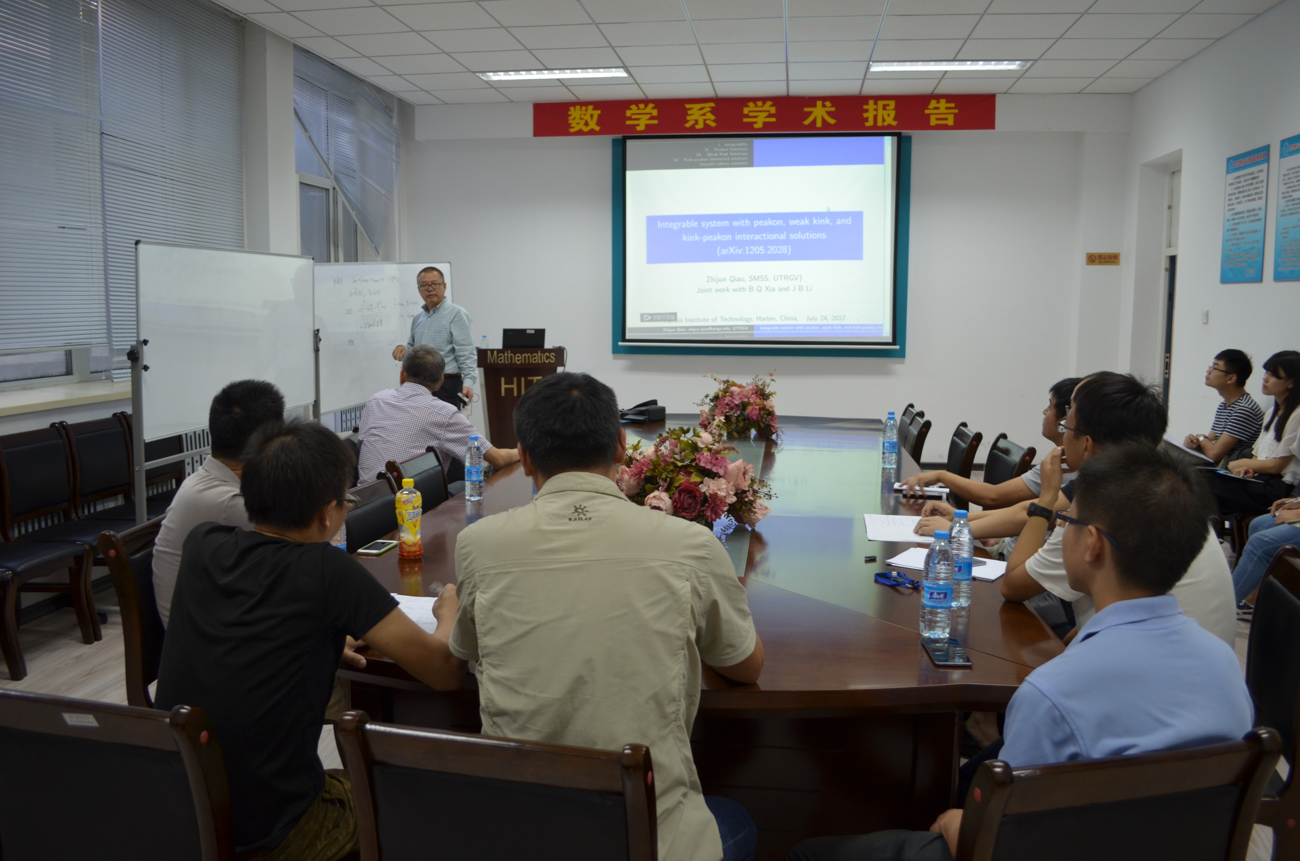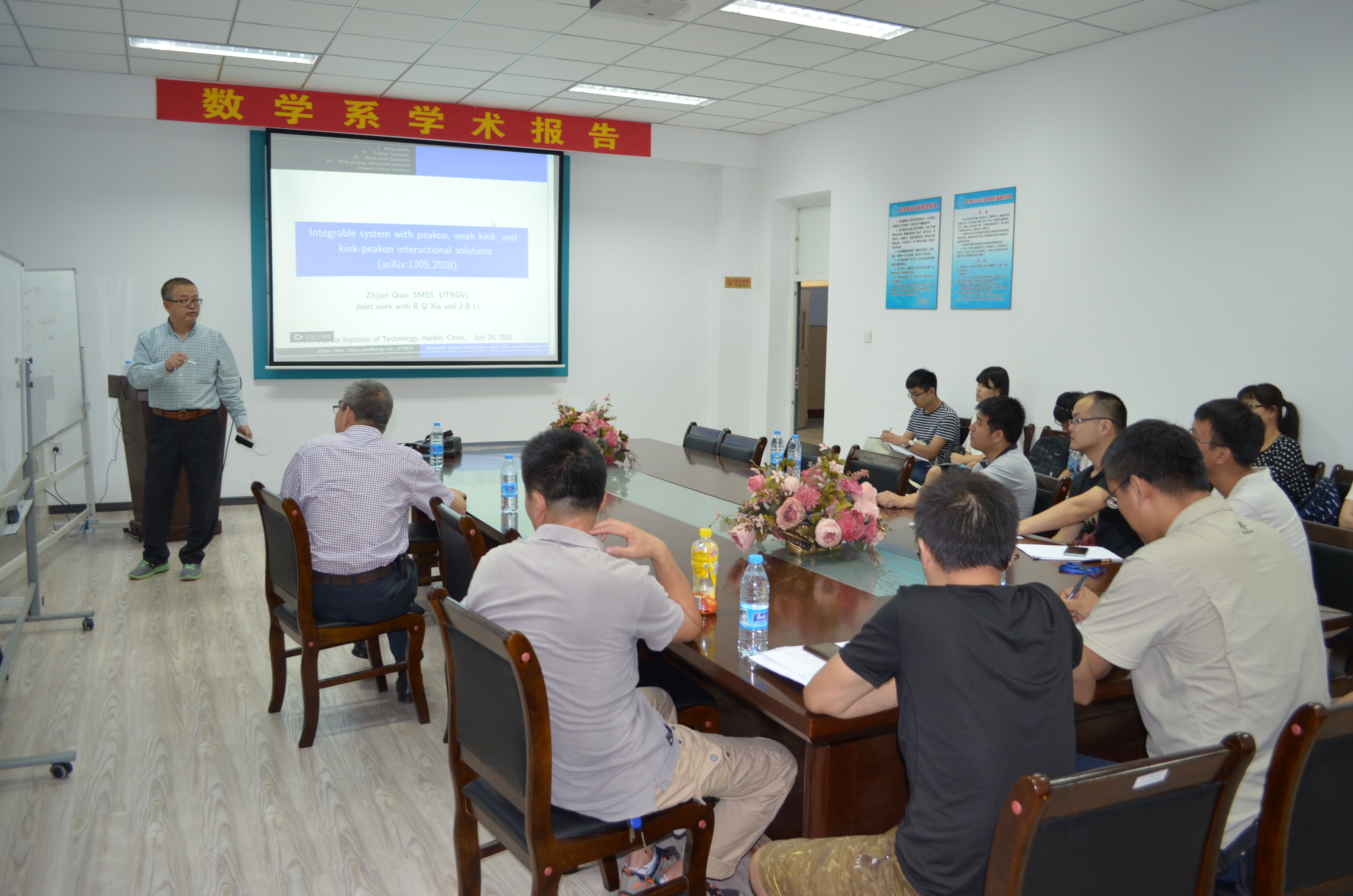 应数学系薛小平教授邀请,美国德克萨斯大学乔志军教授于7月25日访问suncitygroup太阳新城数学系,并作题目为:Integrable system with peakon, weak kink, and kink-peakon interactional solutions的报告。乔教授在报告中向大家介绍了一类非线性偏微分方程,此类方程是可积系统,带有Lax-pair和bi-Hamiltonian结构。该报告向大家介绍了此类方程的一些显式解:带有尖点的孤立子解、多个孤立子、一类新的扭结解。此外,乔教授也对多个孤立子之间的相互作用进行了研究。该报告由薛小平教授主持,相关专业的多位师生参与了讲座,并对讲座内容展开了热烈的讨论。乔教授的报告深入浅出,得到了大家的一致好评。