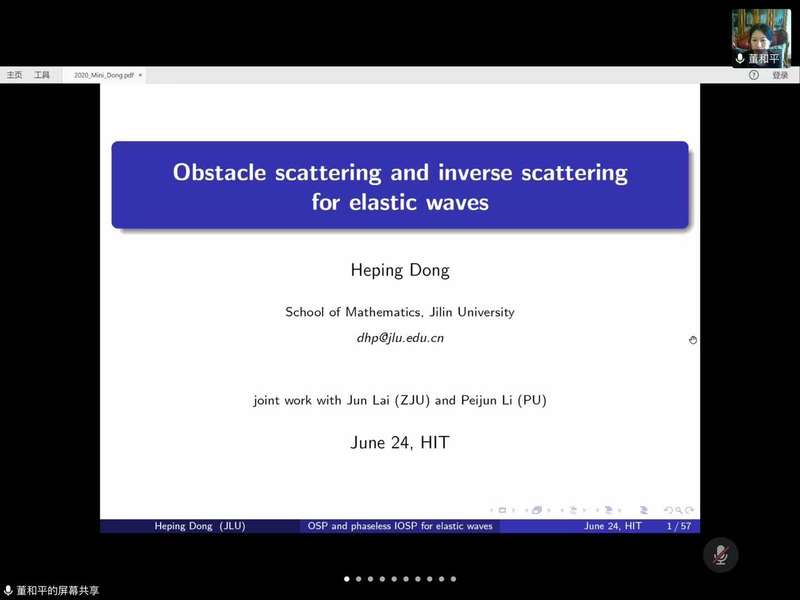 应suncitygroup太阳新城郭玉坤副教授邀请,吉林大学suncitygroup太阳新城董和平副教授于2020年6月24日上午10:00-11:30为公司做了一场在线学术讲座。报告的平台为腾讯会议,会议ID为812 894 313。董老师以Obstacle scattering and inverse scattering for elastic waves为主题为公司师生做了一场精彩的学术报告,介绍了弹性波障碍散射问题的积分方程方法和无相位反散射问题的参考球算法等前沿课题和最新进展。报告由郭玉坤副教授主持,三十余名师生参加了此次在线学术活动,并在会议平台与董老师进行了热烈的交流与讨论。