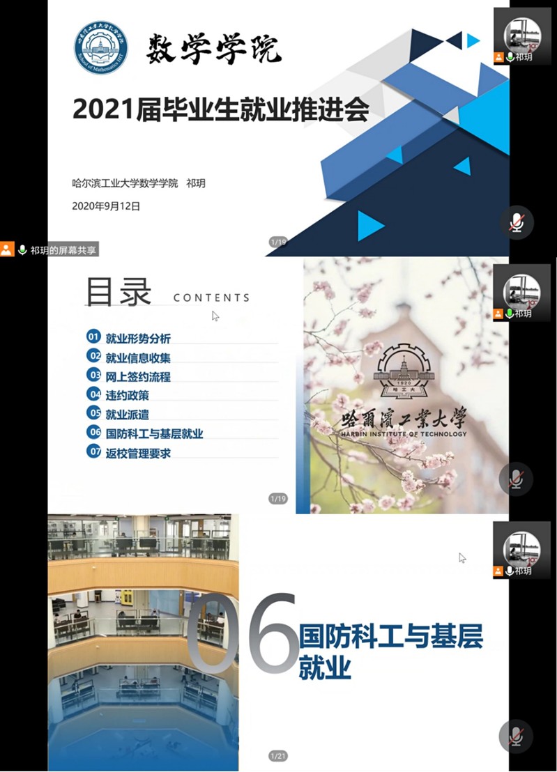 会上,祁玥老师从就业形势分析、就业信息收集、网上签约流程、就业政策与派遣、国防科工与基层就业等方面进行详细说明。首先,她强调了今年不同往年的严峻就业形势,鼓励同学们在9月就业黄金期积极行动,尽早签约,并通过往届毕业生就业数据,帮助同学们思考未来就业方向。随后,祁玥老师对哈工大就业网信息精准查找、生源信息审核、就业推荐表、网上签约管理及就业材料等毕业生相关安排和注意事项进行了介绍。最后,祁玥老师向同学们重点推荐了国防科工与基层单位就业,引导员工积极利用丰富的专业知识投身于祖国的建设和发展中去。