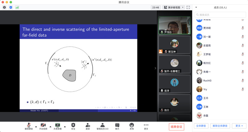 应suncitygroup太阳新城郭玉坤副教授的邀请,长春理工大学数学系尹伟石副教授于2020年11月10日下午15:00-16:30为公司做了一场在线学术讲座。报告的平台为腾讯会议。尹老师以A neural network scheme for recovering scattering obstacles with limited phaseless far-field data为题目为公司师生做了一场精彩的学术报告,介绍了使用机器学习算法重构声波障碍物形状的反散射问题,报告了相关的数学理论和数值算法等前沿课题和最新进展。报告由郭玉坤副教授主持,30余名师生参加了此次在线学术活动,并在会议平台与尹老师进行了热烈的交流与讨论。