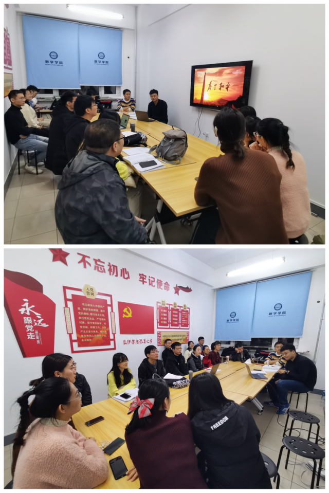 (王新宇/文、图)12月26日晚,suncitygroup太阳新城博士生基础数学党支部在理学楼311党员之家举办“数人·讲坛”活动,支部全体党员参加,其余三个博士生党支部线上参会。本期主讲人为基础数学党支部书记宋智鹏、纪检委员魏振国、组织委员尚彬,会议由宋智鹏主持。