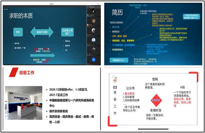 会议伊始,就职于阿里巴巴阿里云智能服务群的李冉分享了他在求职过程中选择互联网行业的原因、工作主要职责以及需要注意的问题,并就求职过程中前期准备、简历投递以及面试流程给学弟学妹们提出了宝贵的建议。随后,张蒙分享了她在求职中选择国防科工行业的初心,并分享了自己在中国船舶集团第716研究所工作以来的心得体会。最后,尹舒婷就深圳教师的求职渠道、招聘流程、以及前期准备进行了详细介绍。