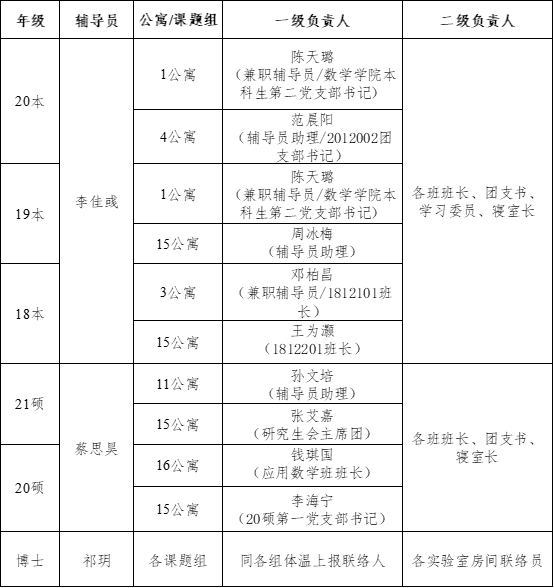 辅导员要将学校对员工的关心关爱传达到位,将疫情防控各项措施落实到位,做好信息摸排上报、在线学习督导、疫情防控管理、员工问题反馈等,将员工生命安全和身心健康保障到位。住校辅导员做到每天至少要深入所带年级宿舍督促线上学习一次、督促打扫卫生一次、有计划地听课一堂。构建“辅导员-员工骨干-寝室员工”的三级联系网络,开展日常在线学习、健康寝室生活和日常情况摸排走访,具体名单如下: