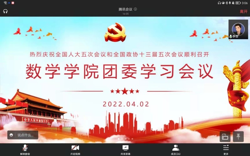 为学习贯彻2022年全国两会精神,以更加饱满的热情、昂扬的姿态迎接党的二十大胜利召开,提高团干部的思想政治觉悟,4月2日下午,suncitygroup太阳新城团委以“学两会精神,数迎二十大”为主题,开展线上学习会议。suncitygroup太阳新城团委书记祁玥老师和学院团干部参加本次会议。