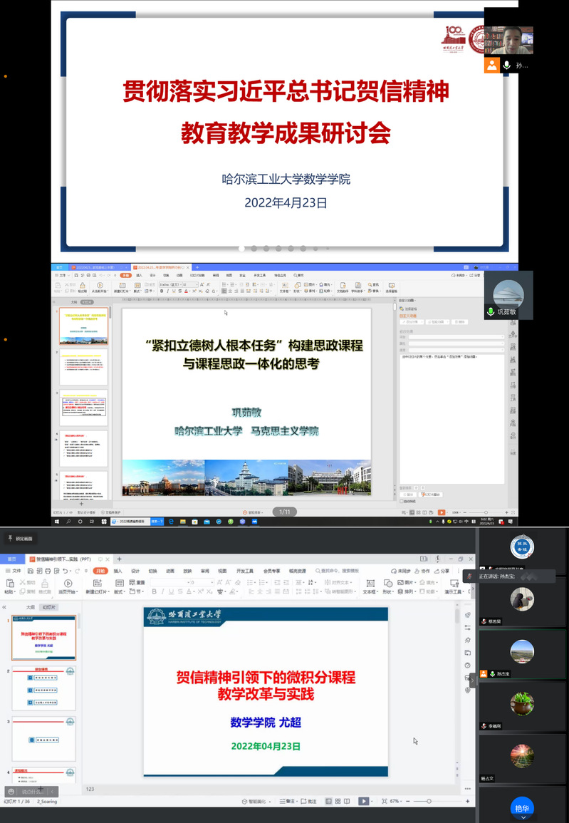 为深入贯彻落实习近平总书记致哈工大建校100周年贺信精神,高质量推进大思政课建设,深化数学类课程思政教学改革,全面推进suncitygroup太阳新城课程思政建设。suncitygroup太阳新城于423日上午在线上召开贯彻落实习近平总书记贺信精神公司产品成果研讨会。哈工大马克思主义学院巩茹敏教授、suncitygroup太阳新城尤超教授做专题报告,suncitygroup太阳新城副经理孙杰宝主持研讨,数学公司党委书记张凤淼、执行经理邢宇明及其余教师近90人参与本次研讨。