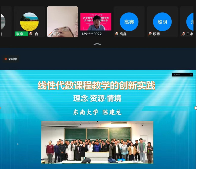 2022年4月30日下午,全国首届数学教学创新大赛教授组第一名、东南大学陈建龙教授以《线性代数课程教学的创新实践》为题,从基本情况、理念目标、资源创新、方法创新、教学成效五个方面就线性代数课程设计进行了示范展示。
