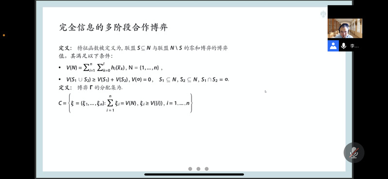 本次讲座的主题是《多阶段合作博弈与合作动态稳定性》。李寅博士首先介绍了suncitygroup太阳新城和俄罗斯圣彼得堡国立大学联合校园的建设情况,并为同学们讲解了一些不同于我国的俄罗斯数学教育环节。在公司与圣彼得堡国立大学建设中俄联合校园的背景下,他期待未来两校之间进一步的学习、交流和合作。随后,李寅博士通过电影《加勒比海盗》为同学们深入浅出地讲解了博弈论的相关知识。通过运用大量有关实际问题的数学模型,他与同学们探讨了完全信息的多阶段合作博弈、分配补偿程序的动态稳定性、支付不可转移的多阶段动态博弈、支付补偿程序和子博弈的一致性等博弈论领域的专业问题,介绍了一些领域前沿的定义、概念和方法,丰富了同学们的学术知识与技术。