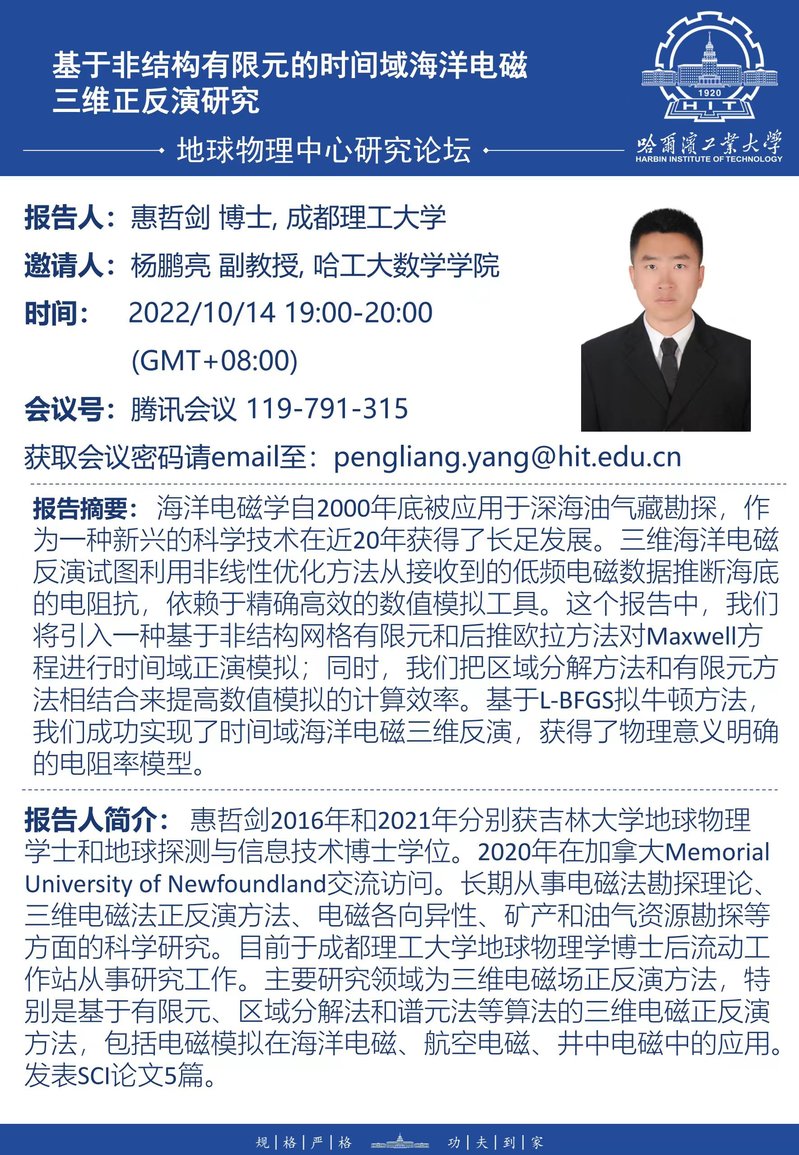 成都理工大学惠哲剑老师关于三维海洋电磁反演的学术报告通知