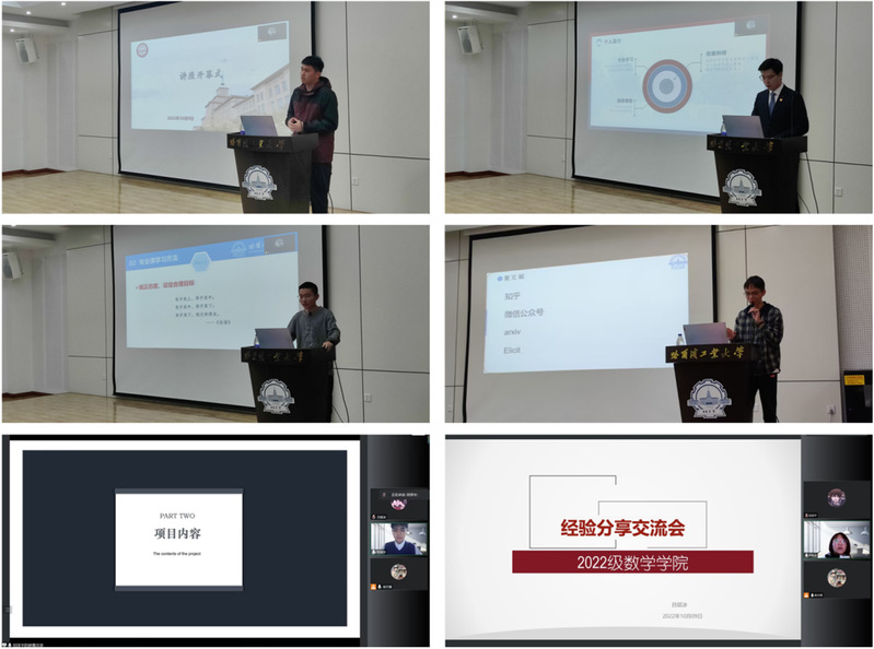 首先,来自21级的田泽宇同学介绍了自己参加大一年度项目的经历与经验。他结合自己大一年度项目内容,详细地阐述了如何选题、分工以及开展项目,为同学们大一年度项目的开展提供了参考。接着,20级的梁潮启同学以自己在国际会议上发表论文的经历为依托,重点分享了本科生如何做科研。他指出,同学们应当积极了解科技前沿,多与前辈探讨交流,切忌闭门造车。21级专业第一的吕镔冰同学,着重介绍了自己的学习方法和在学习中保持专注的经验,她表示每位同学都能找到适合自己的学习方法。21级的殷鹏飞同学着重介绍了一些学习方法和如何端正学习心态,并针对同学们正在学习的课程,给出了课外拓展书目,列举了在学习中容易陷入的误区。最后,20级的吴松蔚同学介绍了自己的大学学习生活经历,以幽默的语气向大家讲述了自己在学习分析、代数、英语、文史、辅修五方面课程时的经验,以及如何平衡学习和生活。在五位学长的演讲结束以后,同学们根据自己的实际情况,向学长进行提问,五位学长耐心细致地给出了自己的见解与建议,活动在热烈的掌声中圆满结束。